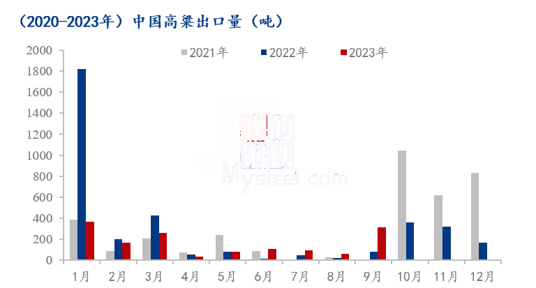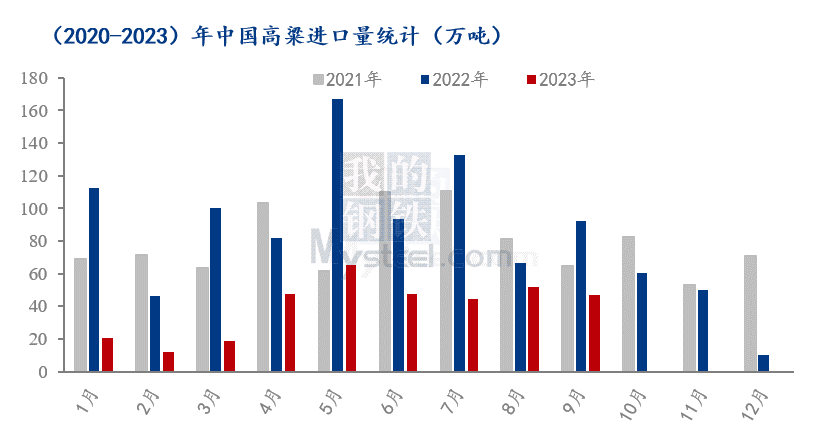 根据海关总署公布的最新数据,2023年9月,中国高粱进口总量为46.78万吨,较7月份减少4.82万吨,环比减幅9.34%,较去年同期减少45.2万吨,同比减幅49.14%。2023年1月-9月期间累计进口量354.47万吨,累计进口量同比减少538.35吨。累计同比减幅达到60.30%。