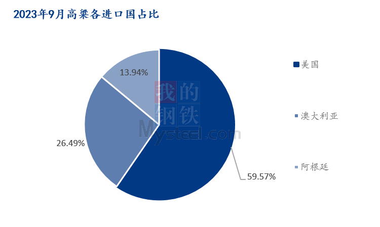 从进口国来看,2023年9月,我国高粱的进口来源国是:美国、澳大利亚、阿根廷三个国家,进口量分别为:27.87万吨、12.39万吨、6.52万吨;本月美国进口量跃居第一位,澳大利亚进口量明显减少明显,阿根廷高粱小幅增加,美国和澳大利亚的进口总量占比达到90%左右。