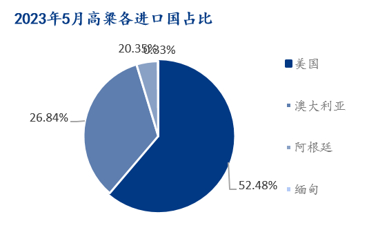从进口国来看,20235月,我国高粱的主要进口来源国主要是:美国、澳大利亚、阿根廷、缅甸四个国家,进口量分别为:40.13万吨、22.33万吨、3.03万吨、0.05万吨;本月美国和澳大利亚的进口量仍旧呈现递增,美国进口量增加14.85万吨,澳大利亚增加7.28万吨,美国和澳大利亚的进口总量占比达到85%左右。缅甸的进口量不足1万吨,进口量相对稳定。
