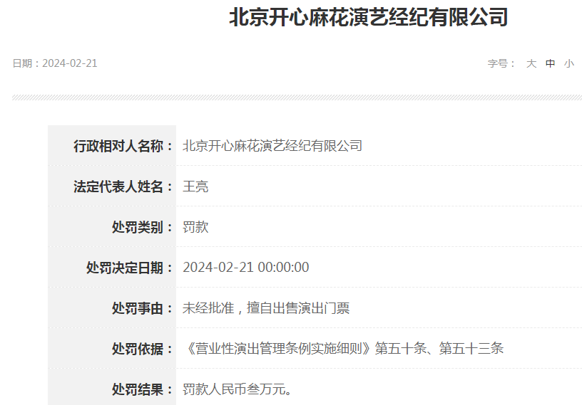 文号为(京)文执罚〔2024〕第200024号的处罚决定书显示,北京开心麻花演艺经纪有限公司,因“未经批准,擅自出售演出门票”,依据《营业性演出管理条例实施细则》第五十条、第五十三条,被北京市文化和旅游局罚款人民币叁万元。