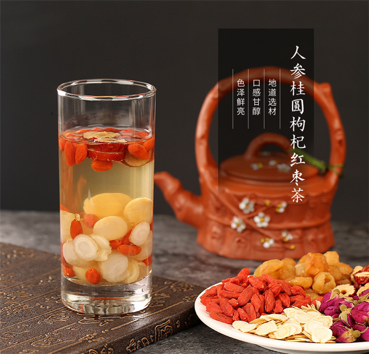 材料:人参、桂圆、红枣、枸杞、玫瑰花、胎菊6味食材一起放入杯中,加入开水冲泡到出茶汤,就可以喝了,味道清香甘甜。