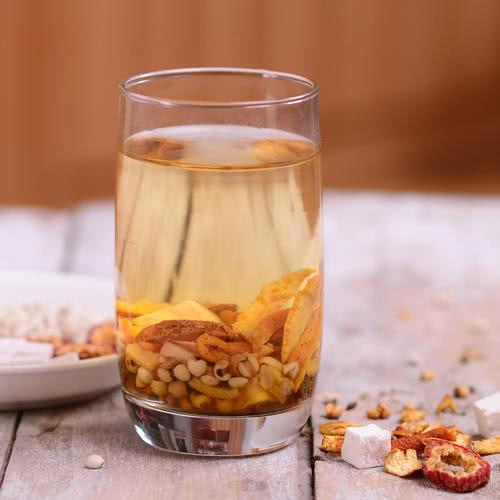 材料:赤小豆、薏米、芡实、红豆、大麦、甘草、苦荞、橘皮、栀子、先把大麦炒熟,然后再把所有食材一起放入杯中冲泡5分钟以上。