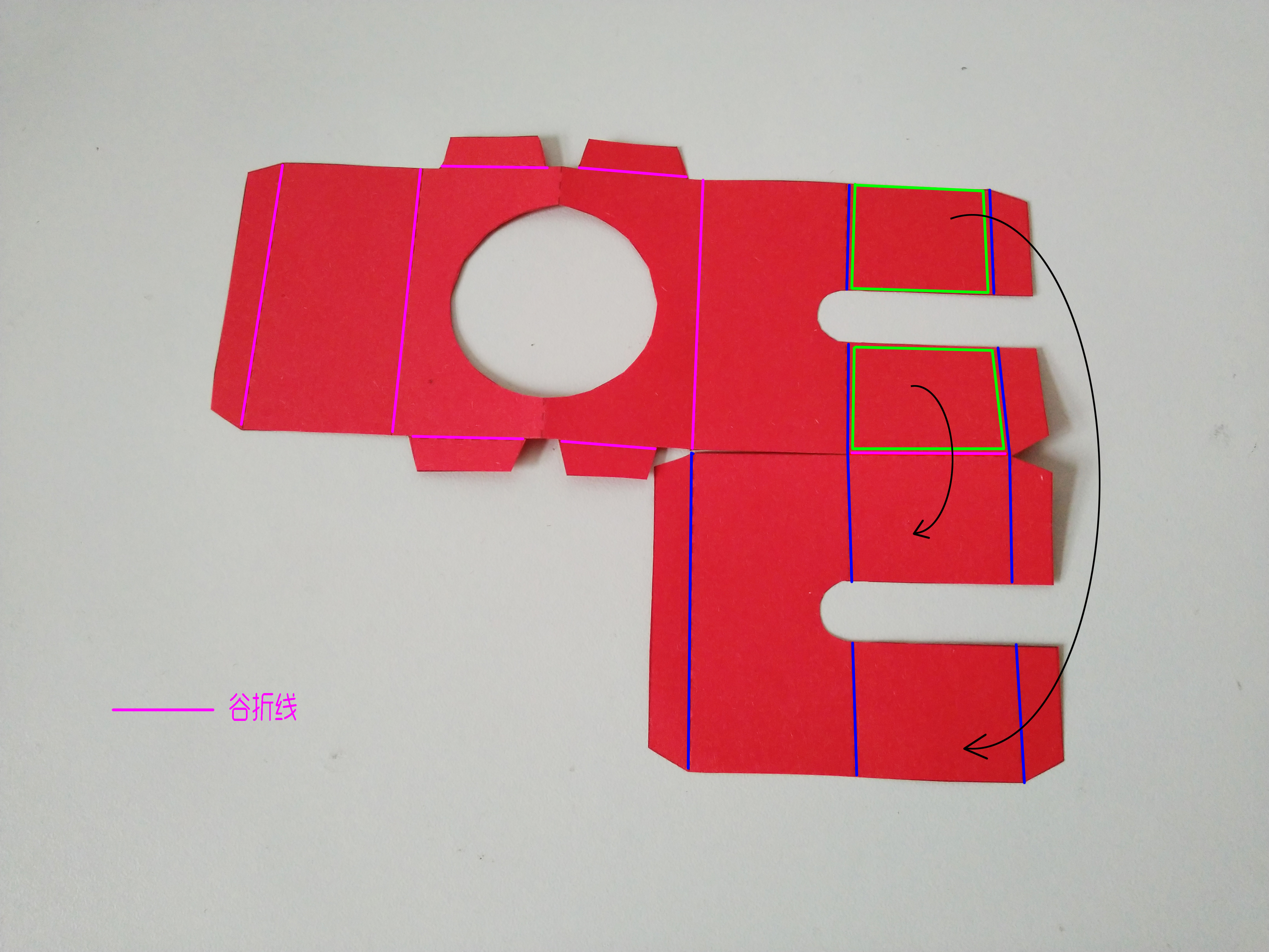 台主体的折法如图,在绿框内涂胶,粘合。