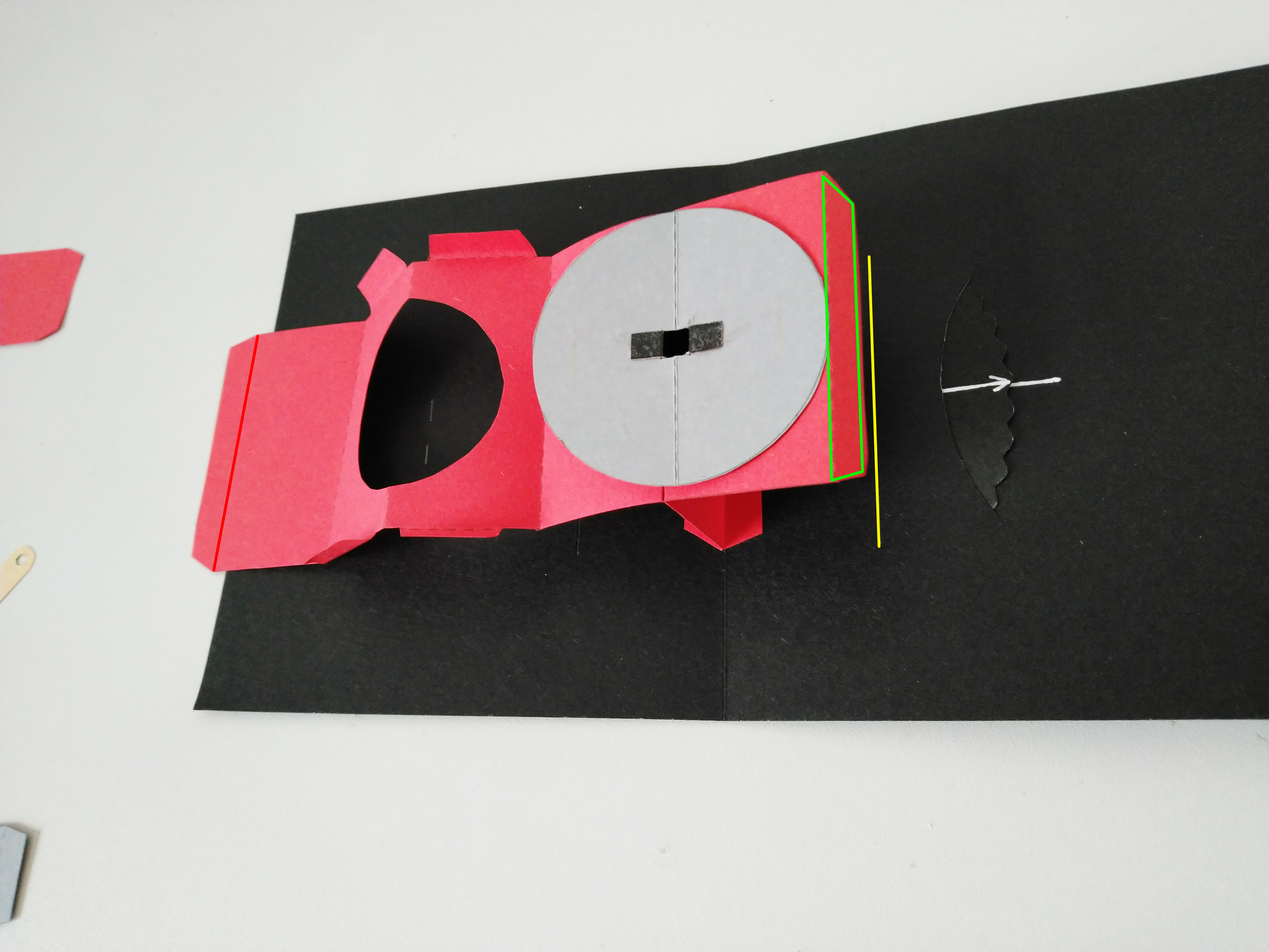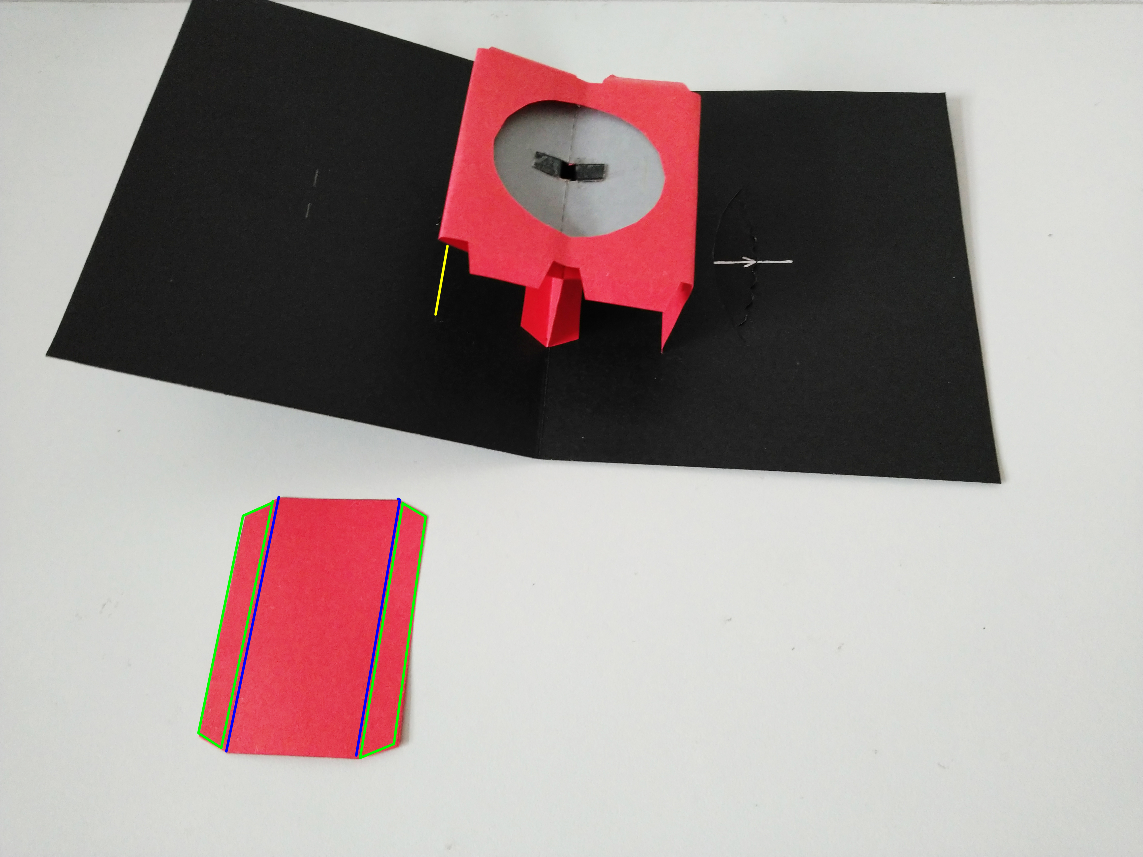 在绿框内涂胶,一侧粘在台主体上,让蓝线对齐主体左缘;另一侧粘在底页上,让蓝线对齐黄线。