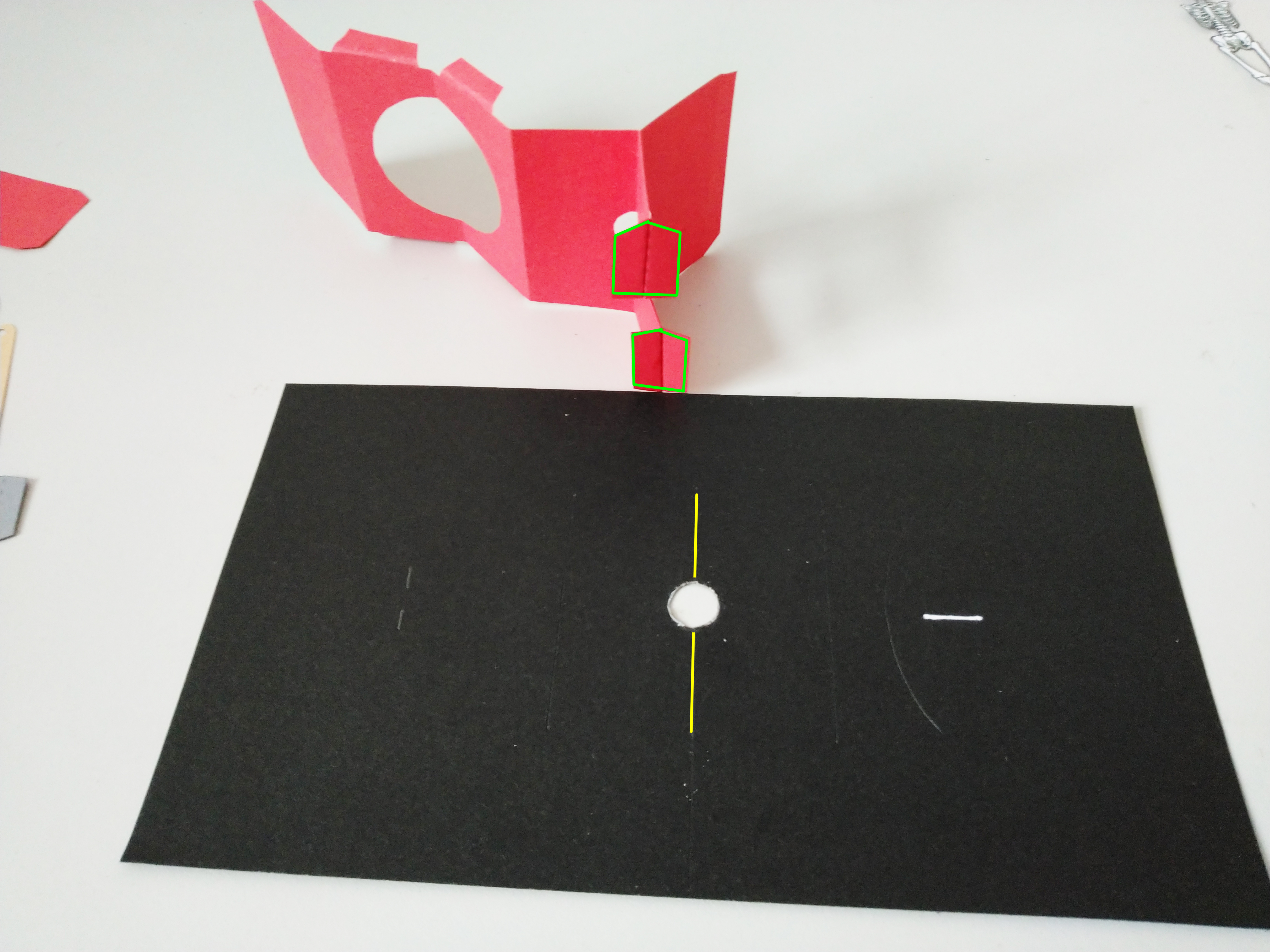 在台主体底部(绿框内)涂胶,粘在底页上,让底部中线对齐黄线。