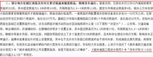 据资料显示,仅在石家庄三环以内的道路上,限高杆的数量就达到了222处之多。其中有113处为2.8-5米的升降限高杆;有103处限高仅为2.8米;还有6处为固定和升降限高组合。面对这些限高杆,别说大货车了,很多就连城市公交只能勉强通过。虽然对限高杆,我们从不陌生,但数量如此之多,限高如此苛刻的限高杆,还是让很多人吃惊不小。
