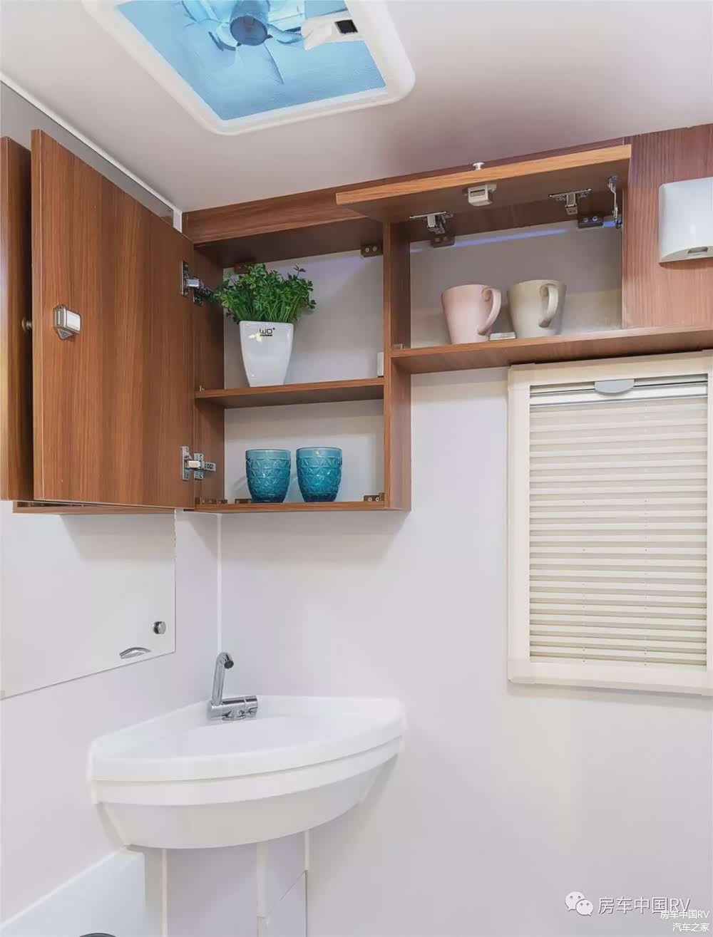 厨房区桌面上配备了电磁炉及带盖板洗菜池,标配了美的家用220v微波炉、城邦房车专用侧出风吸油烟机及房车专用车载12V 85L冰箱。