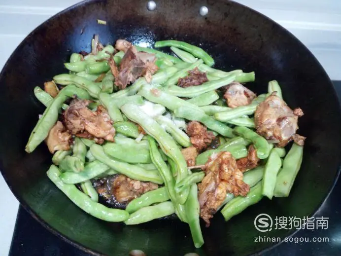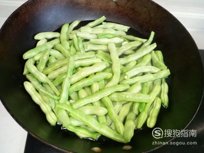 然后放入芸豆翻炒,放入盐。