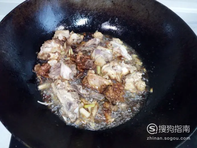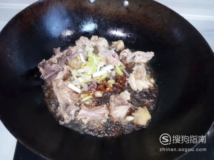 炒至鸡架下油(翻炒多下一些油),放入葱,姜,蒜,翻炒,放入料酒,酱油。