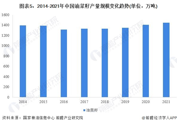 近年来我国油菜籽产量总体维持在1300-1400万吨之间,到2021年,全国油菜籽产量为1445万吨,同比增长2.9%。