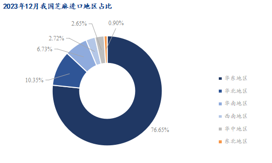 从进口地区来看,12月份我国芝麻进口地区主要分布在华东地区进口50138吨,占比在76.65%,华北地区进口6767吨,占比在10.35%,华南地区进口4402吨,占比在6.73%,,西南地区进口1778吨,占比在2.72%,华中地区进口1733吨,占比在2.65%,东北地区进口591吨,占比0.90%。