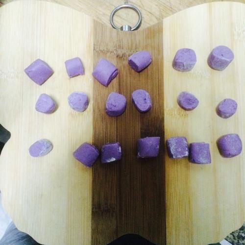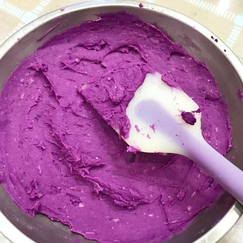 揉成不粘手的光滑的糯米团,不加一滴液体,干湿度刚好,但不同的紫薯芋头糯米粉吸水性不同,如果觉得干了可以加少了牛奶或清水。