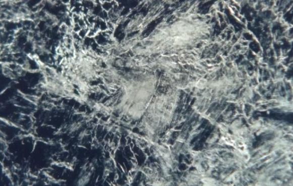 呈孤立状态分布的钠长石“矿物棉”;反光面棉点部位有凹陷通过宝石显微镜,矿物棉基本上呈团状或团块状分布于翡翠之中,与周边的翡翠矿物有明显的不同。