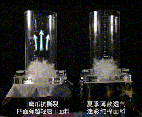 同样一团羽绒,同样的力量向上吹气。普通纯棉面料这边,羽绒团几乎没动;而鹰爪这边,羽绒团飞起来了!比纯棉面料透气性都好!