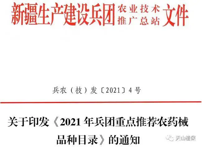 为提高兵团主要农作物病虫草害防控效果,持续推进农药减量控害和绿色发展,保障农业生产安全,农产品质量安全和生态环境安全。我站在多年多点大田试验示范的基础上,广泛征求各师、团农业技术人员意见,筛选了一批适合兵团主要病虫草害防治的农药品种和绿色防控产品重点进行推荐。现将《2021年兵团重点推荐农药械品种目录》印发给你们,请各师因地制宜地向职工推介宣传,加强推广应用,同时加强技术指导和农药与药械市场管理,严厉打击经营假冒伪劣农药和药械产品的违法行为。