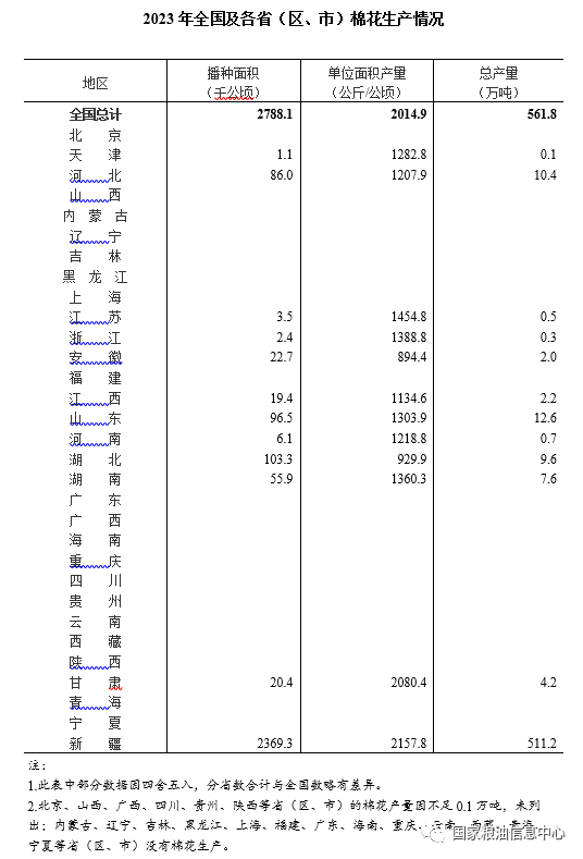 根据对全国31个省(区、市)的统计调查(新疆棉花播种面积通过遥感测量取得),2023年全国棉花播种面积、单位面积产量和总产量分别如下: