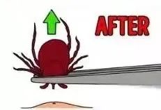一旦发现有蜱虫叮咬、钻入皮肤,最好用酒精涂在蜱虫身上,如果找不到酒精,可用乙醚、煤油、松节油、旱烟油等涂在蜱虫头部,也可以在蜱虫周围点蚊香,使蜱虫“麻醉”,让其松口;再用尖头镊子抓住蜱虫,“垂直拔出”,用力均匀,不要扭曲或拉动蜱虫,要完整除去。