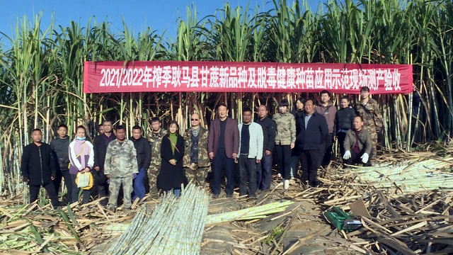 1月5日至7日,由云南省临沧市耿马傣族佤族自治县工业和科学信息化局组织,邀请有关专家对耿马蔗区新引进筛选的高产高糖新品种进行现场测产验收。专家组选取具有代表性的不同海拔、不同土壤类型的9个生态点的300亩示范和4000亩连片甘蔗种植区进行产量和蔗糖分现场鉴评。测产结果表明,新一代甘蔗新品种平均亩产达9.22吨、平均田间锤度18.43%,分别较老品种(“新台糖22号”和“粤糖93-159”)亩增产3.07吨、甘蔗糖分高0.83%(绝对值,甘蔗糖分按田间锤度×0.69计算),其中“云蔗08-1609”最高亩产11.67吨,“云蔗05-51”最高亩产9.19吨。